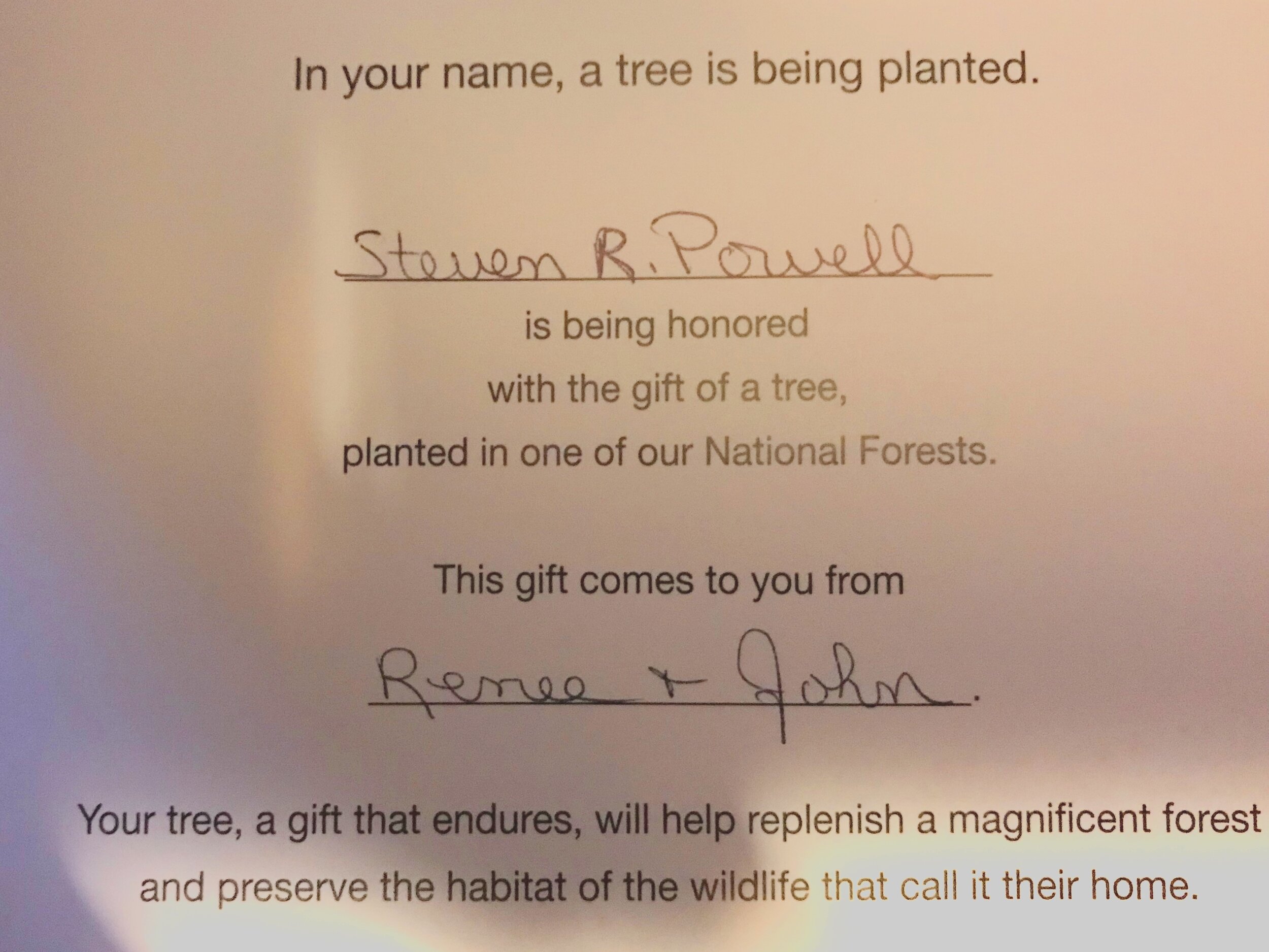 Thank you both so much for the sweet honor to Steven. Do you have any idea how much he loved trees? During a tribute night held to remember Steven, so many shared stories of finding him barefooted, sitting in a tree, sipping tea. So very kind, thoughtful, and loving.