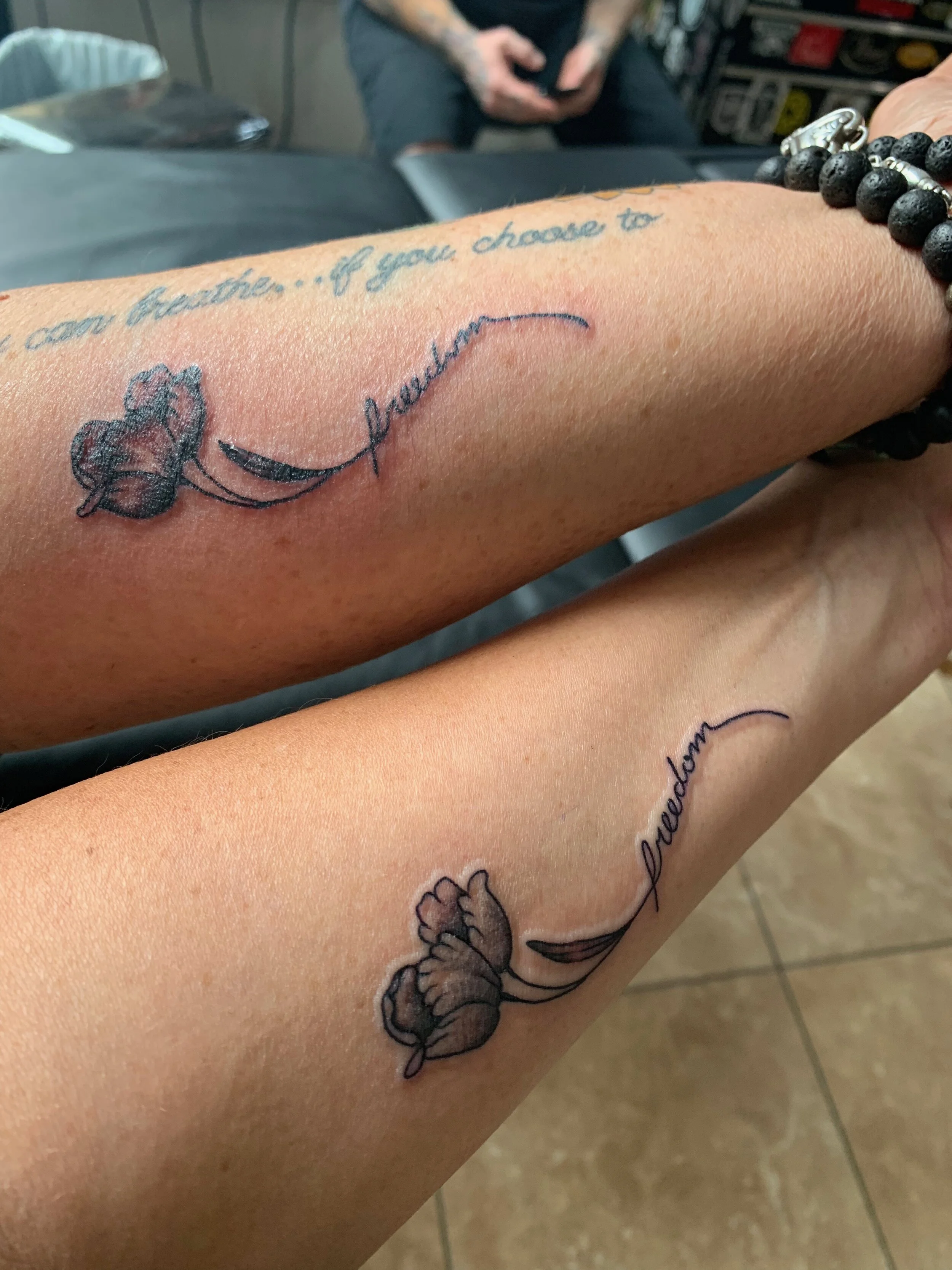 These are flowers choosing to grow right beside each other. They’ve grown from one solid stem and branched off separately but growing, thriving beside each other throughout the duration of its beauty and life. My forever friend and I got these matching tattoos together. They represent our lives, separately and together forever, joined in beauty, life, and love. We both love each other unconditionally. We both have beautiful, loving families and we've been in the thick of life together and for each other, for decades. We’ve experienced much together, so similar, but just different enough to afford each other’s shared wisdom. The hills and valleys of life worked out perfectly for our sweet, God-given friendship. It didn’t just happen, we worked at it and it grew over the years. We cared, we loved, we made the effort. We both know we have each other's constant support and prayers. We usually have not lived in close proximity to each other, so when we’re together, it's that much more appreciated. I adore her and will forever be grateful for the gift of this sweet, loving human.